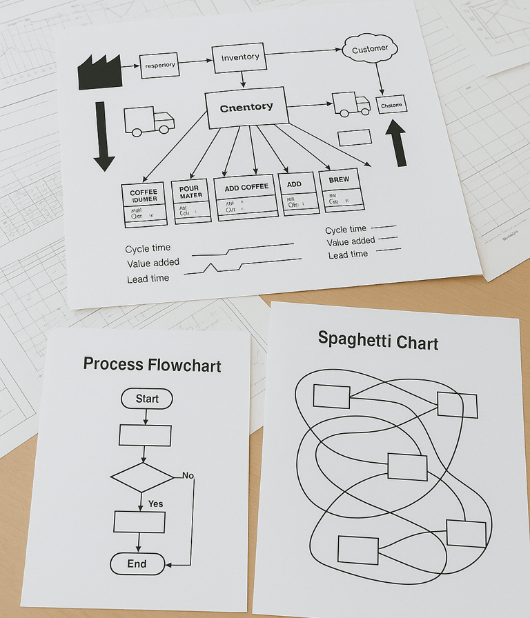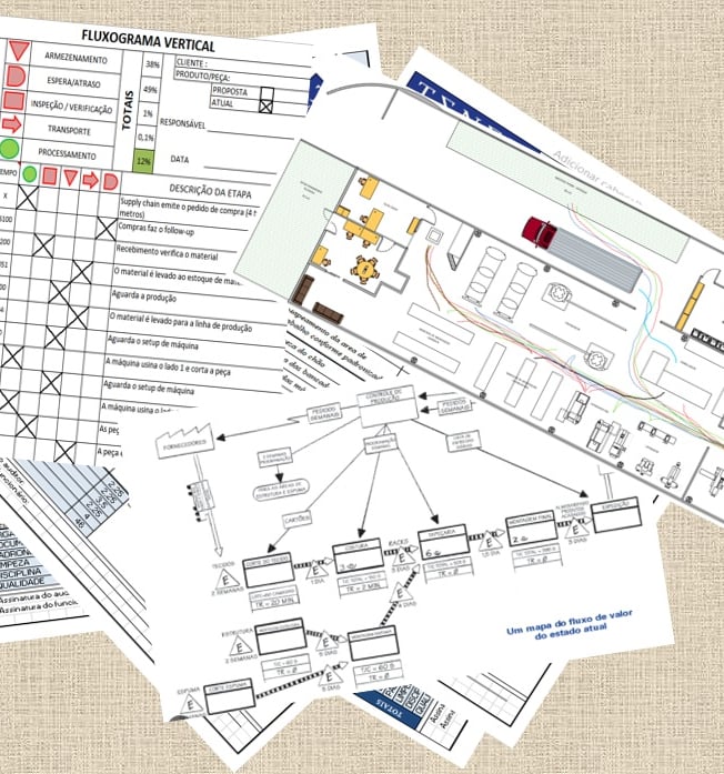 VSM (Value Stream Mapping): O mapeamento do fluxo de valor permite avaliar diversos tipos de desperdícios ao longo da linha de produção, indo desde o pedido do cliente até a entrega. é uma das principais bases para a redução dos oito desperdícios e direcionamento de Kaizens.